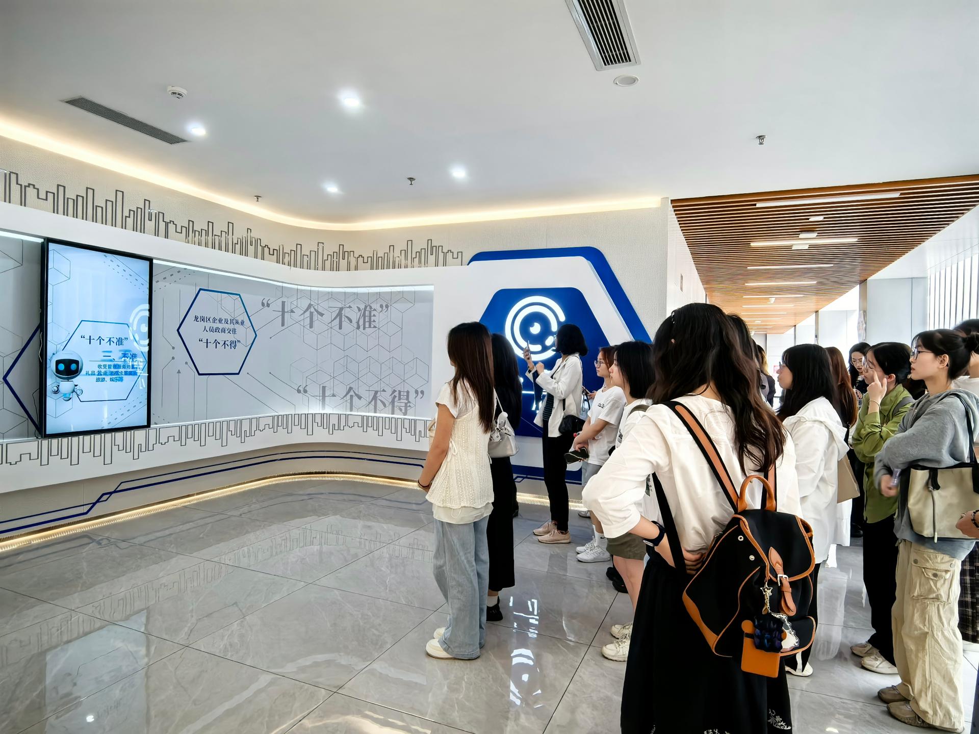 在讲解员的引导下,全体师生们驻足“纪·空间”观看“互动滑轨屏”呈现的“十个不得”、“十个不准”,然后在大运AI小镇“亲清”空间廉洁文化阵地,观看了廉洁从业警示教育片,通过以案说法、以案释纪,让广大党员师生知敬畏、存戒惧、守底线,接受深刻的廉政清风洗礼。