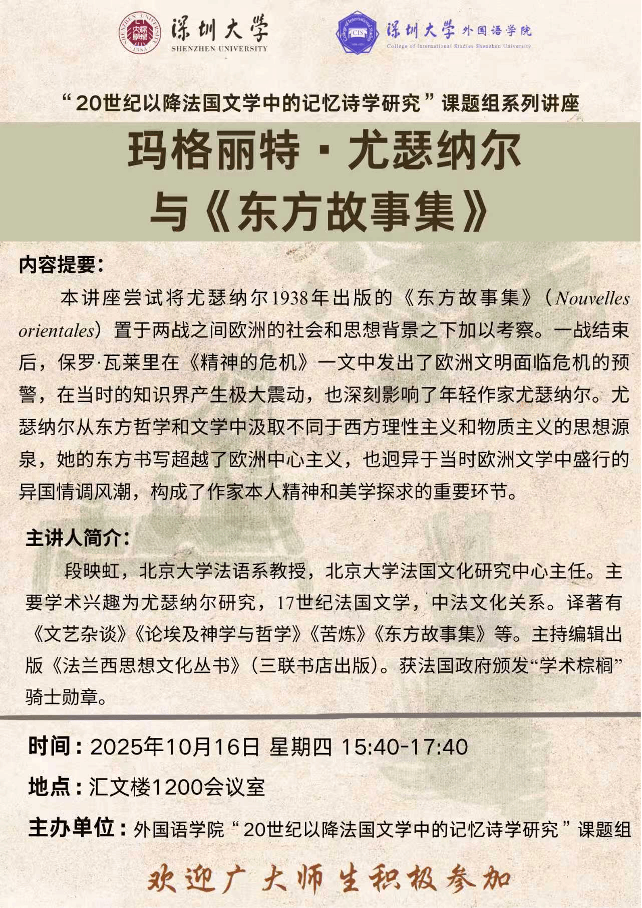 2025年10月16日下午,“20世纪以降法国文学中的记忆诗学研究”课题组系列讲座在深圳大学外国语学院汇文楼H2-202举行。段映虹教授应邀作题为“玛格丽特·尤瑟纳尔与《东方故事集》”的学术讲座。本次活动由深圳大学外国语学院翁冰莹教授主持。讲座吸引了外国语学院和人文学院众多师生参加,现场交流互动频繁,学术氛围浓厚。