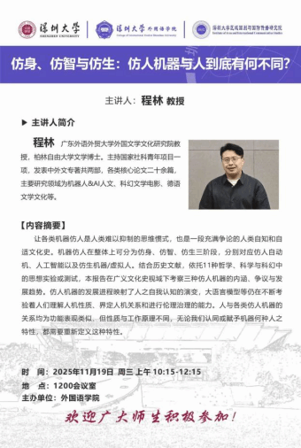 2025年11月19日上午,广东外语外贸大学外国文学文化研究院程林教授应邀做客我校,在汇文楼1200会议室为师生带来了一场题为“仿身、仿智与仿生:仿人机器与人到底有何不同?”的精彩讲座。本次讲座由外国语学院主办,吸引了来自外国语学院、物理与光电工程学院、医学部、人文学院等多个学院的师生积极参与。