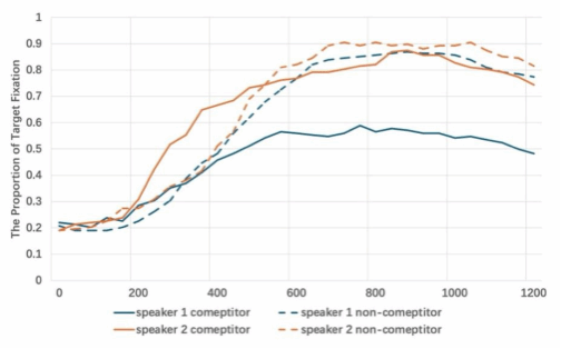 在关键词出现后约200 ms起,受试者表现出由视角对比驱动的启发式理解;至400 ms左右,注视模式进一步反映话语整合带来的语义理解,显示了语境信息与说话人视角的整合过程。